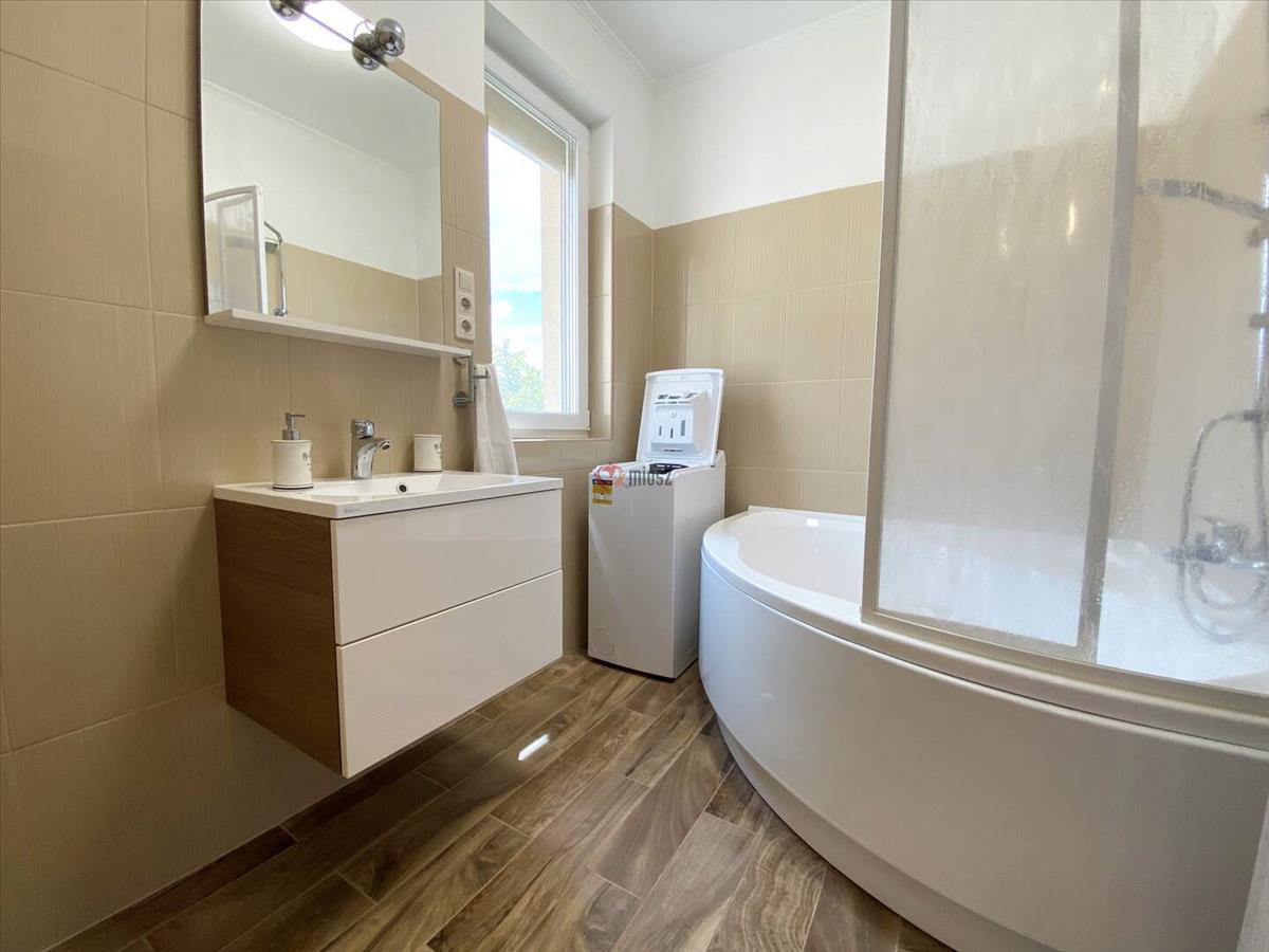 A fürdőszoba zuhanyzós, mosógéppel felszerelt, a wc külön van, és ablakos.
