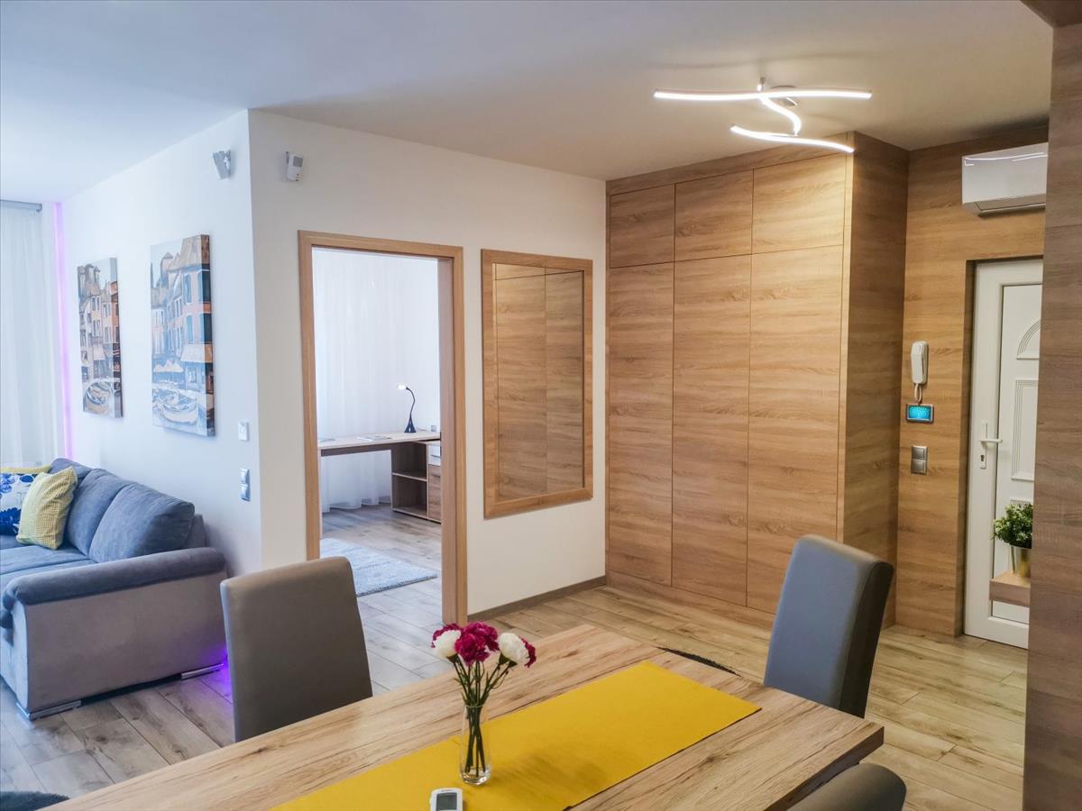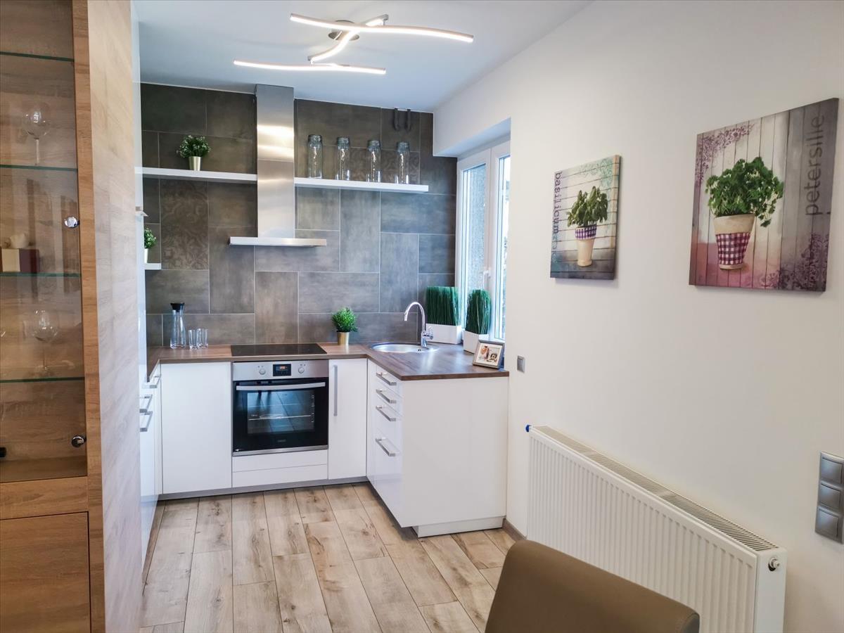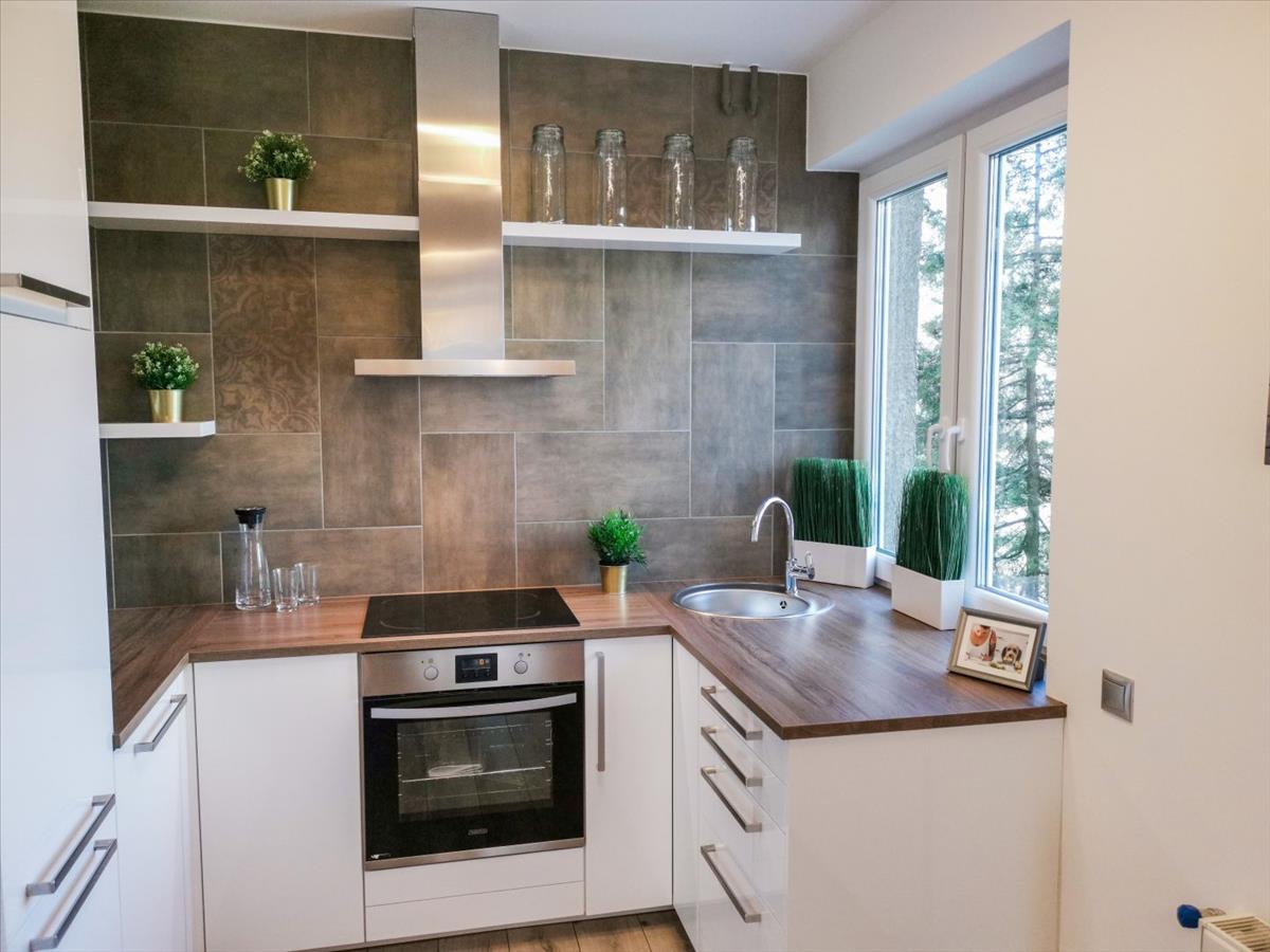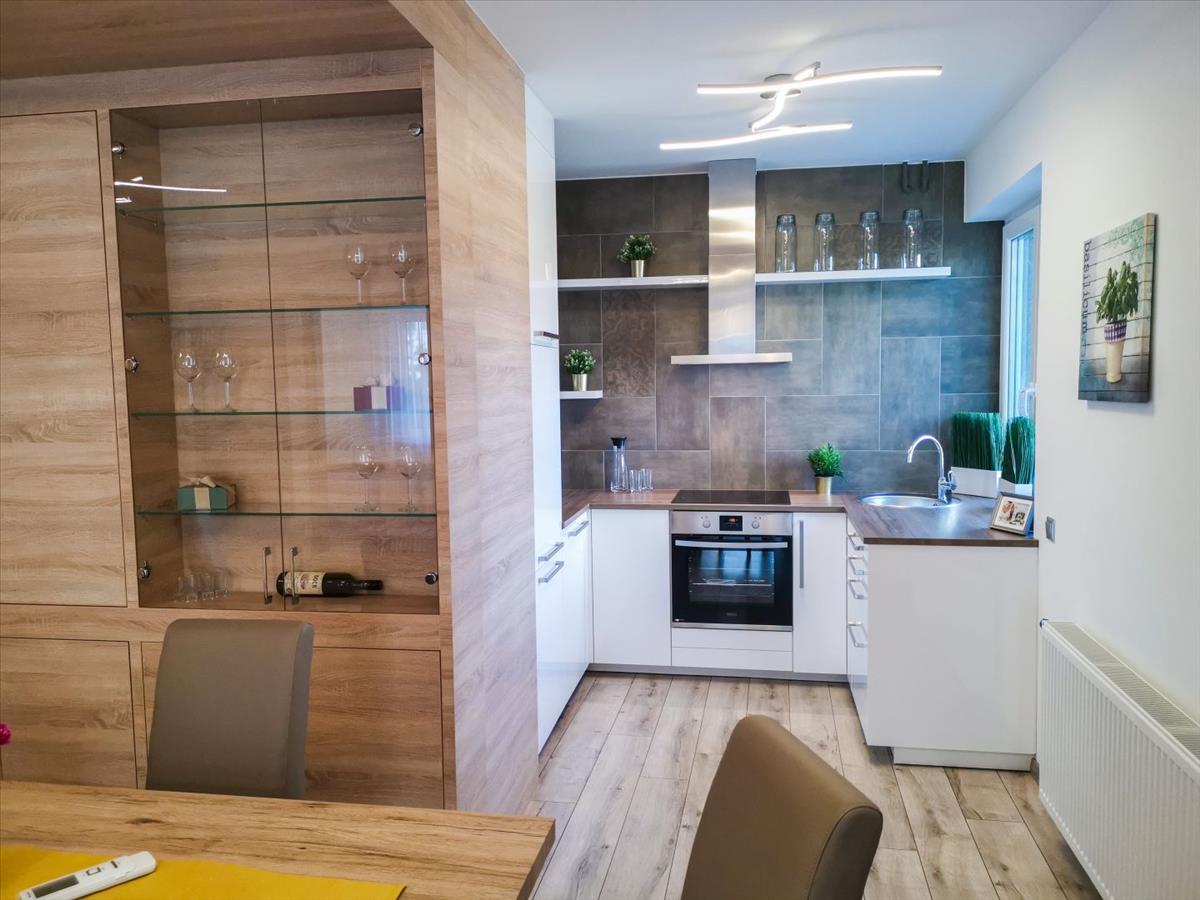 - Gépesítve: beépített hűtő, mosógép, beépített sütő, indukciós kerámia főzőlap, kürtős páraelszívó, mikró