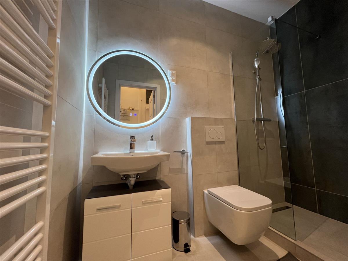 - Fürdőszoba: modern zuhany, hajszárító, nagy led világítású tükör