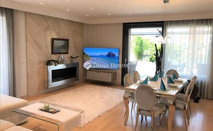 A terasz 64m2, melyen kialakításra került egy kombi szauna (infra- és finn szauna), jakuzzi, kültéri zuhanyzó. a terasz kényelmes kerti bútorokkal van berendezve, melyet eső érzékelős pergola véd.