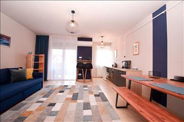 A 55 m² apartment is available for rent on Nap Street, 1st floor. The apartment features a kitchen/living room, two separate bedrooms, and a balcony. It is fully renovated, furnished, and equipped with appliances. The property also has air conditioning and an individual gas heating system. The bathroom and toilet are in separate rooms.