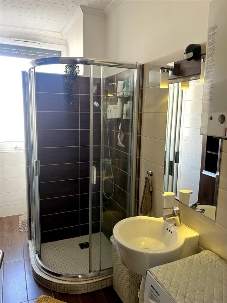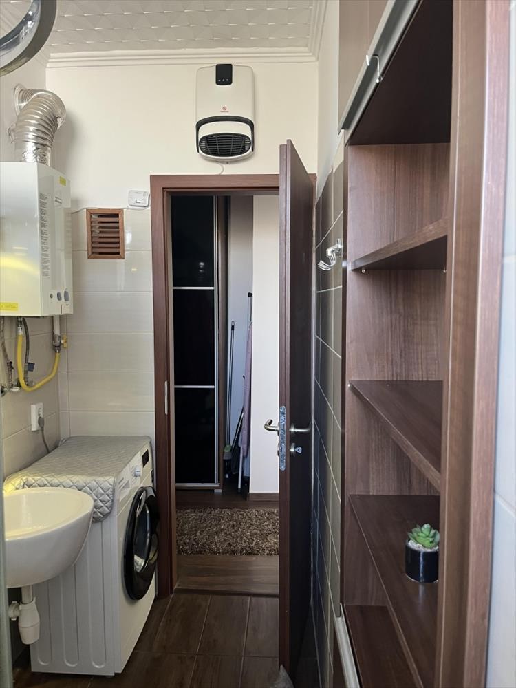 Fürdőszoba zuhanykabinos kialakítású, mosógéppel felszerelve, wc-vel együtt van.
