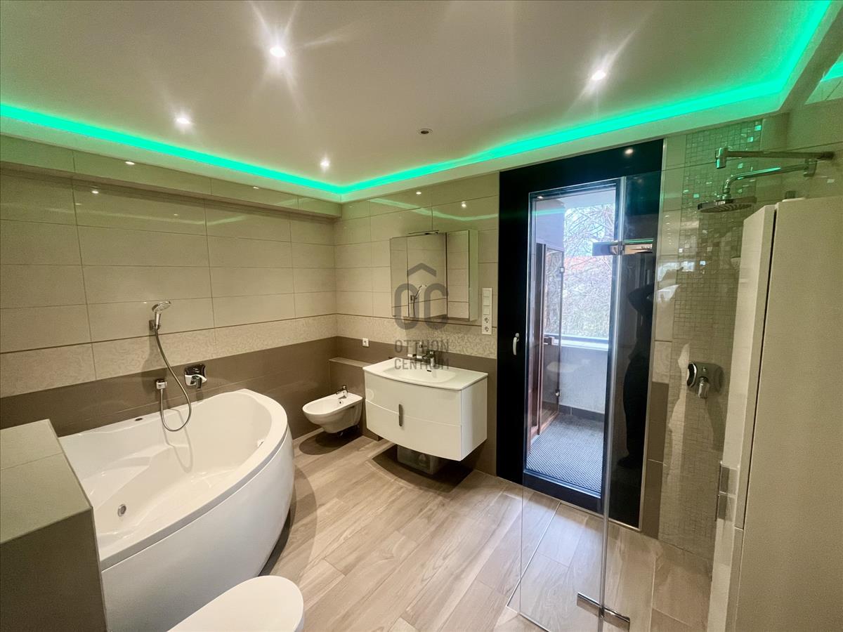 A fürdőszoba szállodai színvonalú: exkluzív burkolatok, magas minőségű szaniterek, sarokkád és külön zuhanyzó biztosítja a tökéletes kényelmet. Különálló wc és praktikus mosókonyha is található a lakásban.