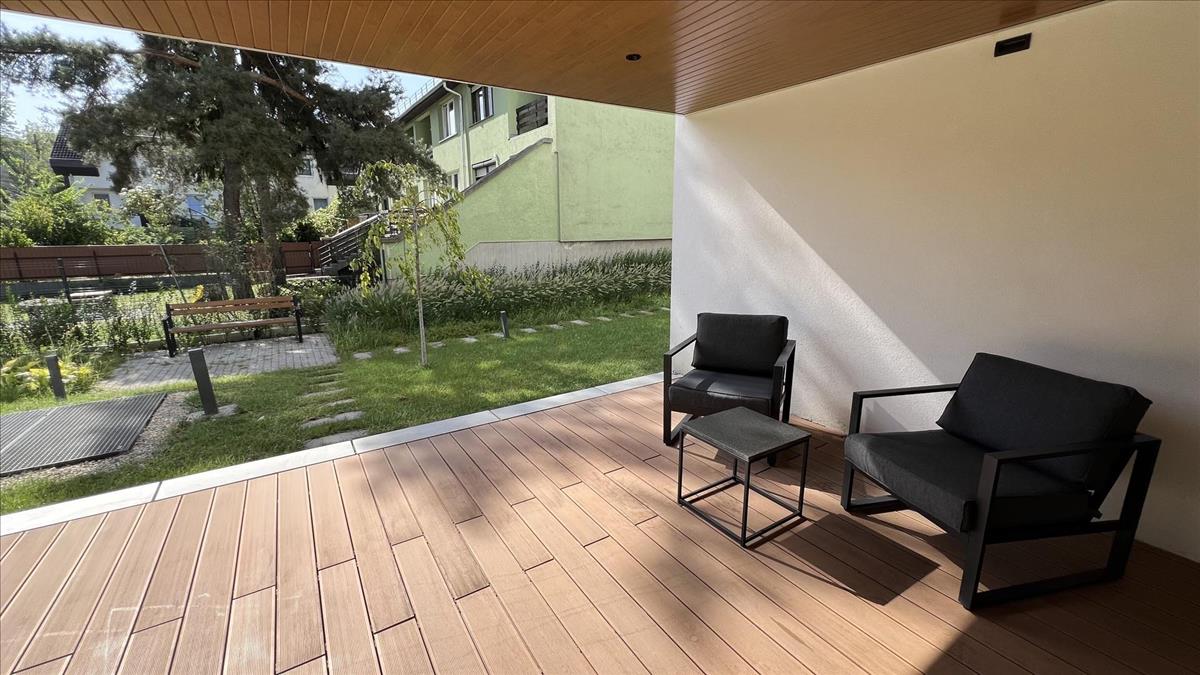 Terasz: mérete 15 m2; impozáns terasz, pazar panorámával, kényelmes kanapéval, két fotellel és két asztallal.