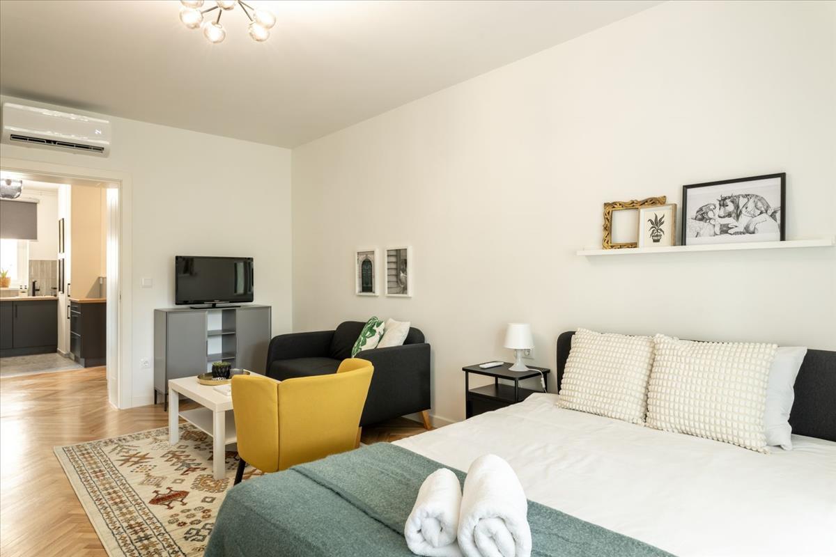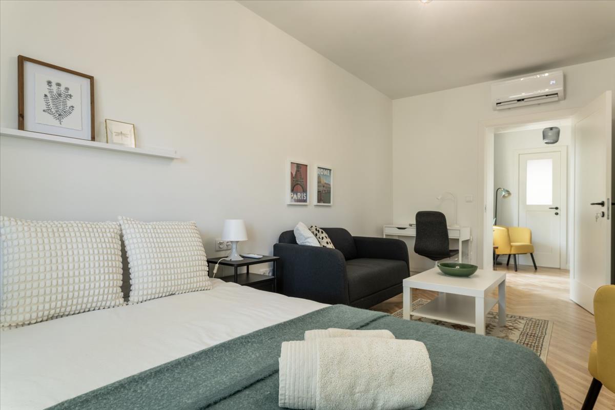 Mindkét szoba elég nagy ahhoz, hogy kényelmes nappali–háló–dolgozó funkciót töltsön be, a berendezés is ezt tükrözi, így teljes értékű privát teret biztosít a lakók számára.