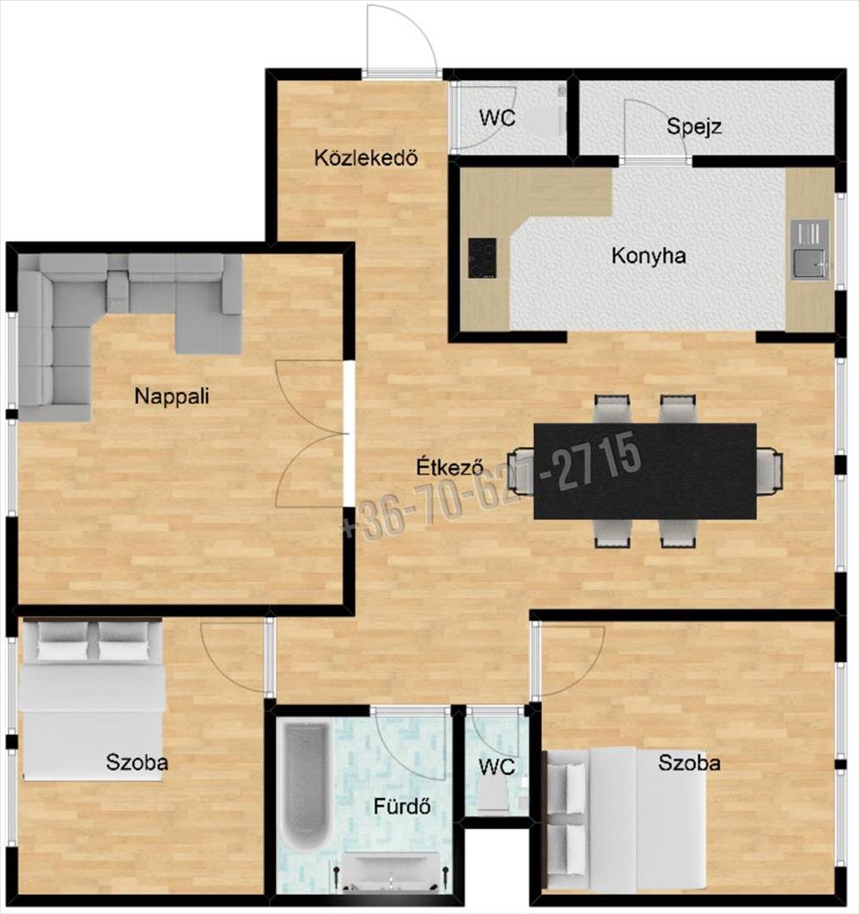 - nappali + 2 szoba, konyha, kamra, étkező, fürdőszoba, 2 db különálló wc
