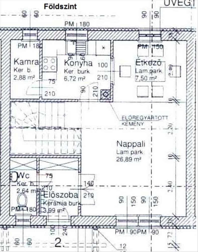 Földszinten nappali, étkező, konyha, kamra, előszoba, wc helyiségek (50 m2), tetőtérben 3 fél szoba, fürdőszoba, előtér helyiségek (39 m2).