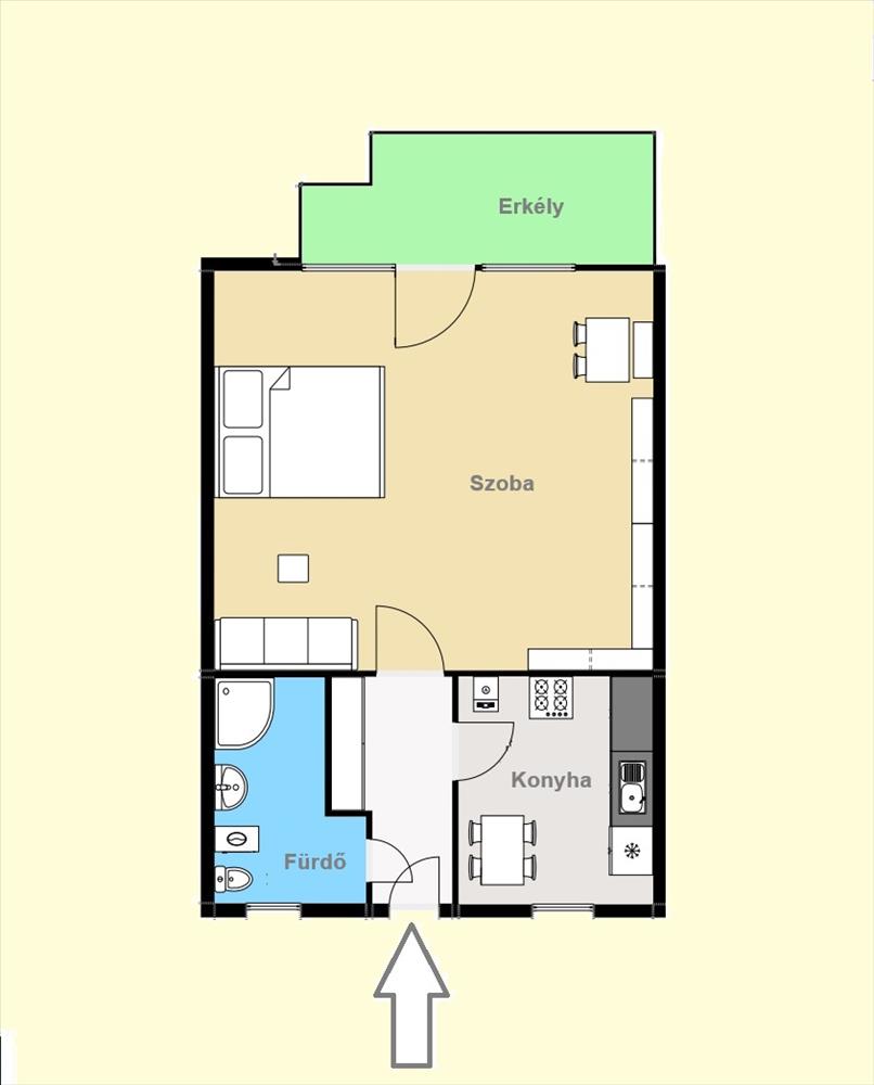 - 1 szobás lakás, mely egyúttal nappali, háló és dolgozó is