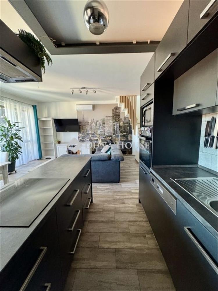 A világos, napfényes élettér, a gondosan kialakított helyiségek és a nagy méretű beépített tárolók a mindennapok kényelmét szolgálják. a nappali és a tetőtéri szoba klimatizált, utóbbiban hűtő-fűtő klíma és infrapanel biztosítja az egész éves komfortot. a tetőtéri Velux ablakok pliszé árnyékolóval, sötétítővel és szúnyoghálóval felszereltek, a lakás többi részén elektromos redőnyök gondoskodnak a kényelemről és a megfelelő árnyékolásról.