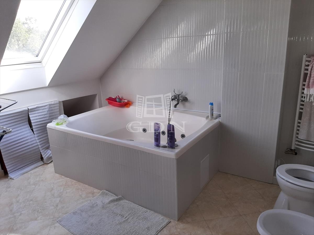 Kényelmes kiosztású lépcsőn jutunk a felső szintre, ahol egy kisebb gyerekszoba, egy méretes hálószoba és egy igazán hatalmas és pazar fürdőszoba került kialakításra. Az itt lakók felfrissülését egy jakuzzi funkciójú kád biztosítja.