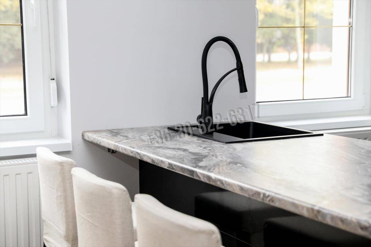 Az igényes burkolatok, a beépített konyhabútor, valamint a külső és belső nyílászárók egyaránt a visszafogott eleganciát és funkcionalitást tükrözik.