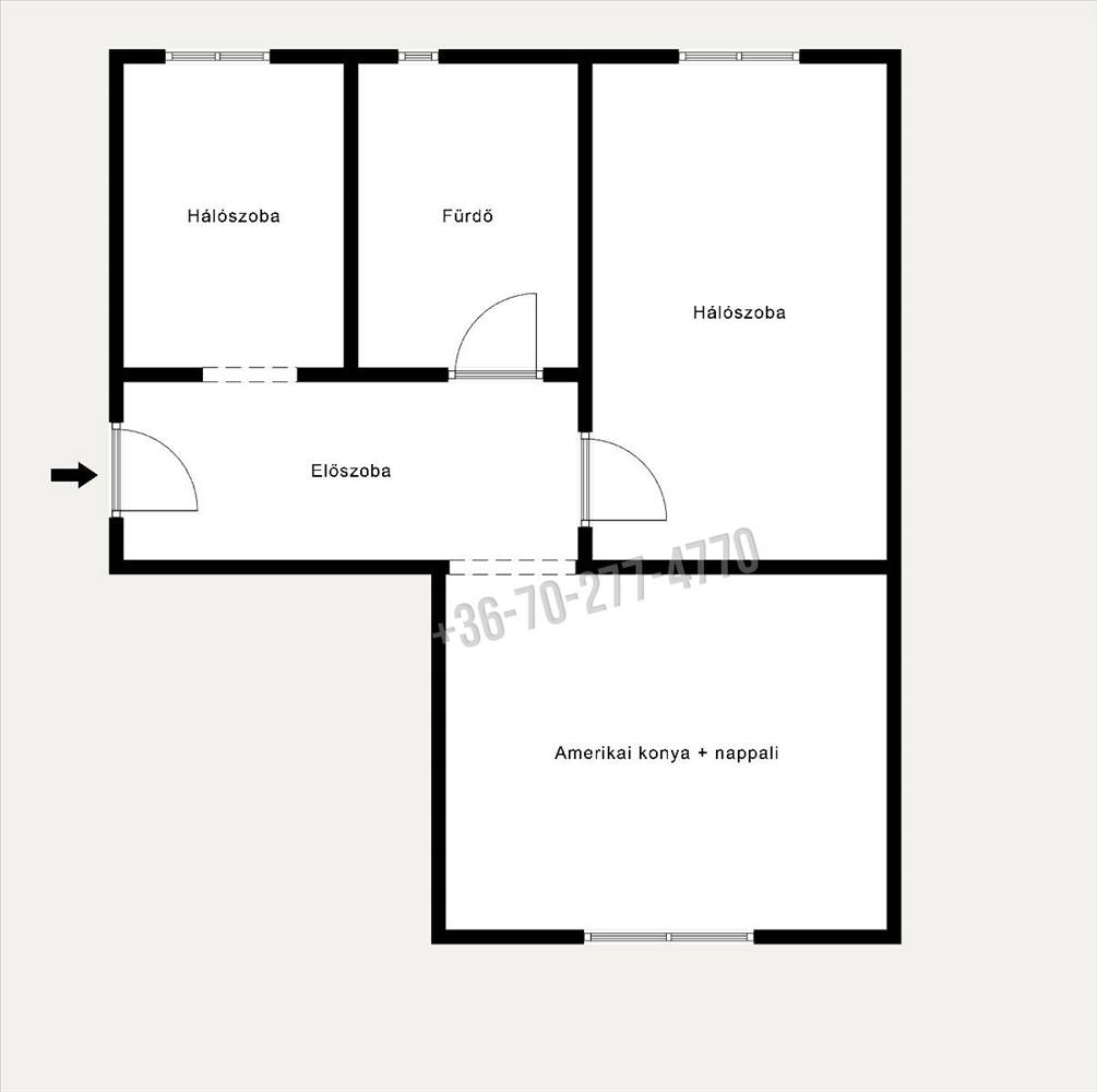 Tágas amerikai konyha + nappalival, és két külön nyíló hálószobával rendelkezik. a fürdőszoba káddal és wc-vel, egy helyiségben került kialakításra.