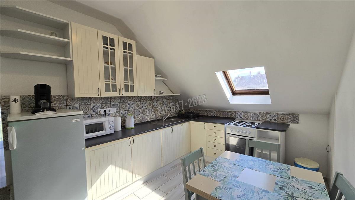 A tetőtéri lakásban kettő plusz egy fél szoba, nappali, konyha-étkező, fürdőszoba+wc található.