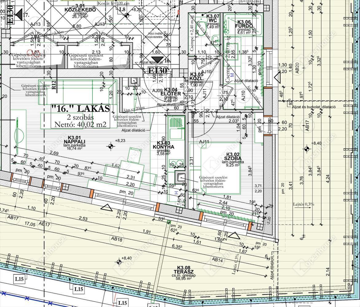 3. emeleti 16-os lakás 40. 02 m2 alapterületű 55. 05 m2-es terasszal.