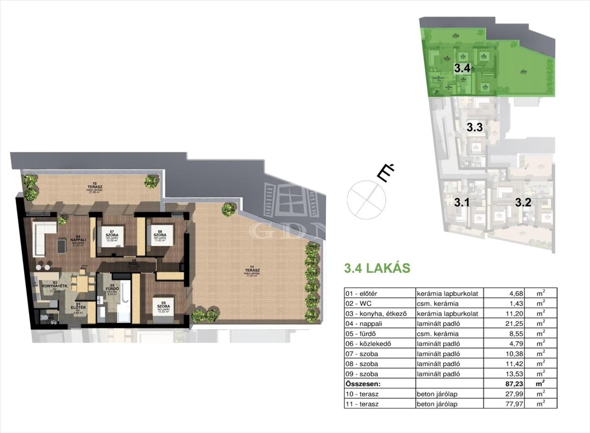 -amerikai konyhás nappali + 3 szoba (10, 38 nm ; 11, 42 nm ; 13, 53 nm)