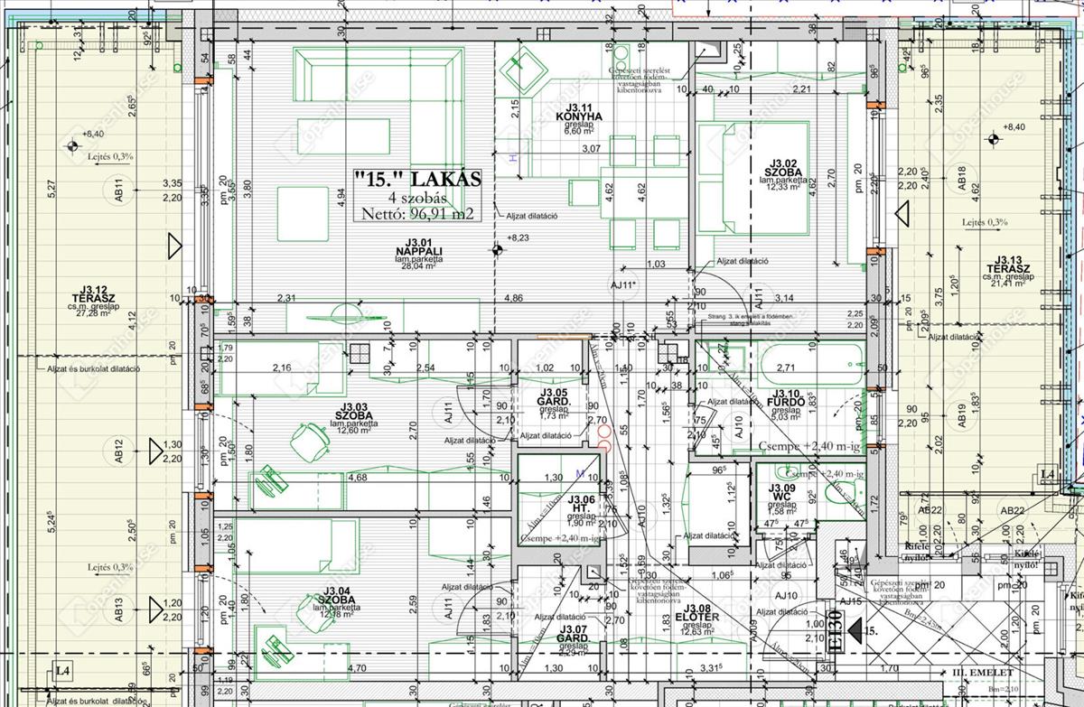 3. emeleti 15-ös lakás 96. 91 m2 alapterületű 48 m2-es terasszal.