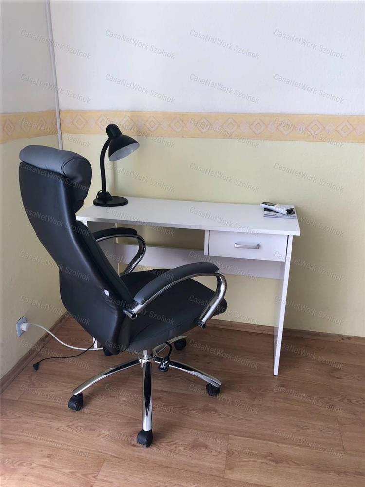 2 szoba tölgyszínű laminált parkettával burkolt (ágyazható, nagyméretű ülőgarnitúra, szekrénysor, íróasztal, forgószékkel)