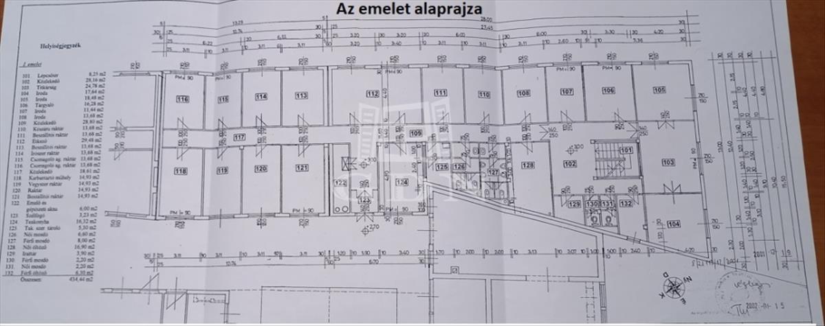 Az emelet hasznos alapterülete 287 nm, étkező, konyha, női és férfi WC-k, öltözők, tárgyaló, és 15 irodának vagy raktározásra használható szoba található ezen a szinten.