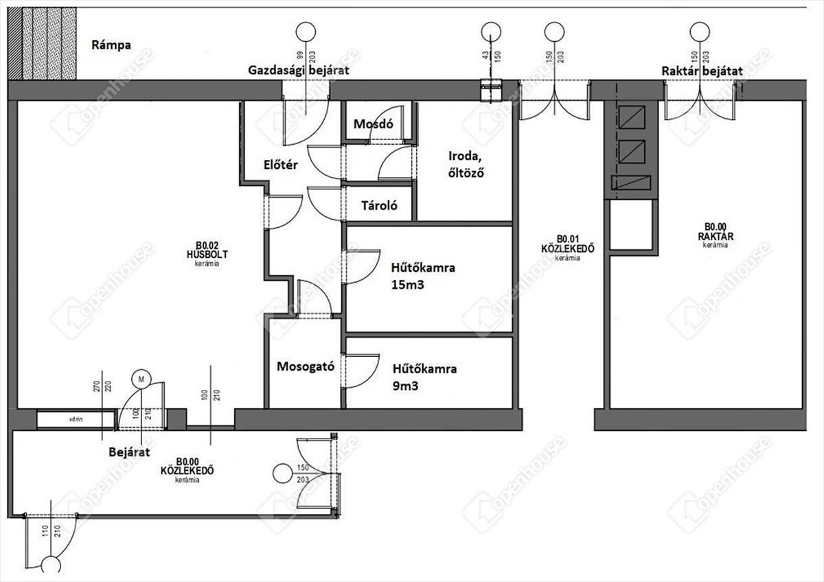 - Helyiséglista: előtér, húsbolt, mosogató, mosdó, iroda/öltöző, tároló, 2 db hűtőkamra, közlekedő, raktár