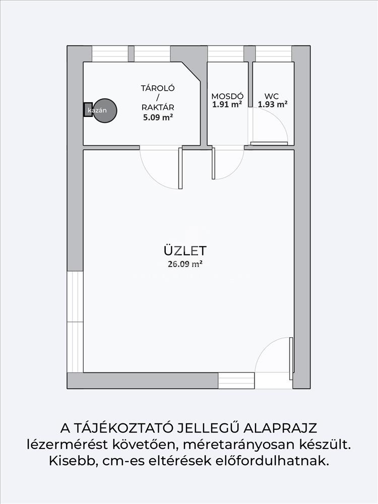 Az ingatlan alapterülete 35 m2, mely ~26 m2 üzletteret, ~5 m2 tárolót és ~4 m2 mosdót foglal magába.