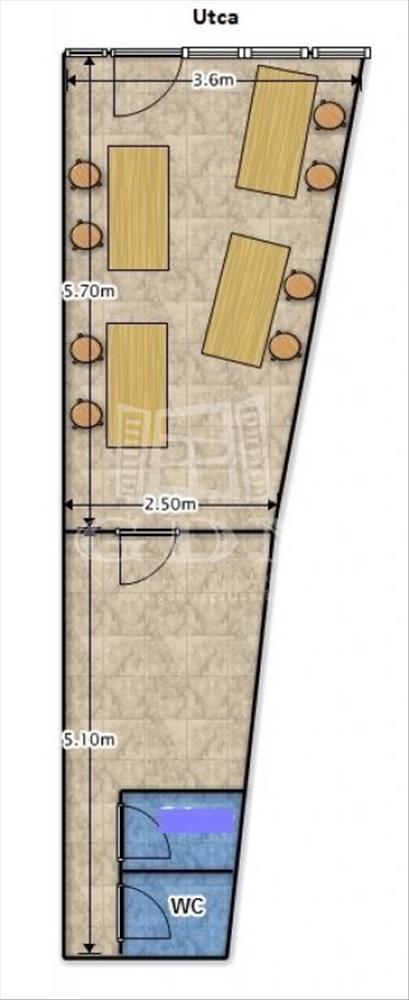 A helyiség két részből áll. Elől ügyféltér, hátul pedig egy kis tárgyaló, zárható helyiség, WC-kézmosó.