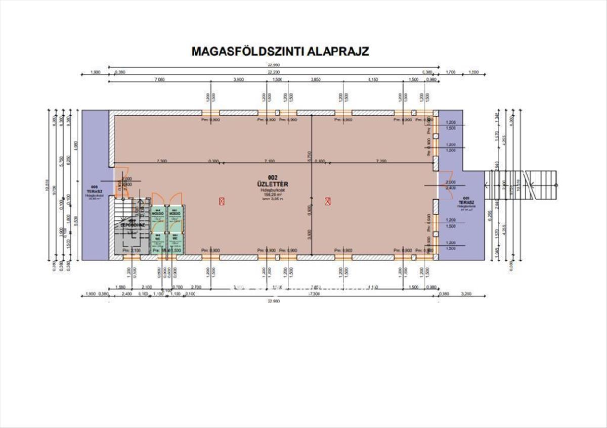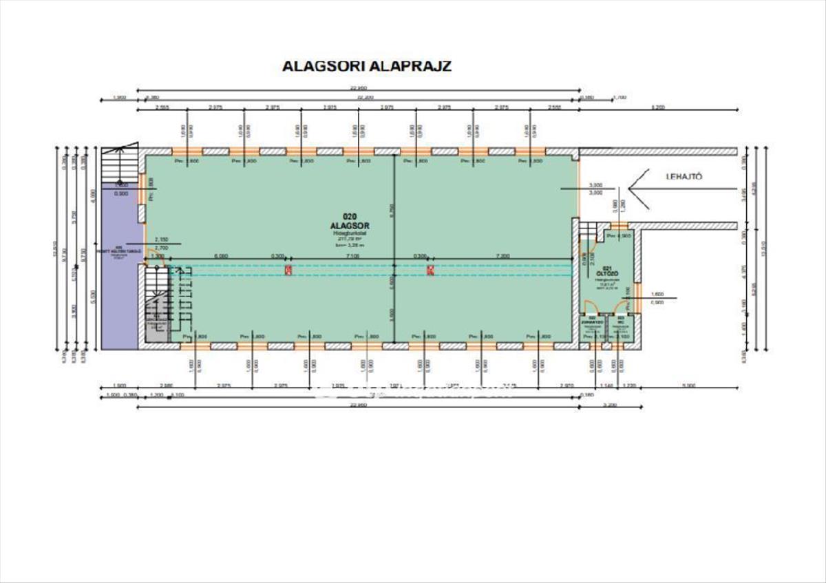 A szuterén 232 nm-es egyterű helyiség, mely raktározásra alkalmas, továbbá magába foglal egy öltözőt, zuhanyzót és WC-t is. Ide targoncával is be lehet menni. a magasföldszinten található a 198 nm-es üzlethelyiség, melynek belmagassága 3, 8 m. Ez a helyiség négyzetméterenként akár 2 tonnával is terhelhető. Itt kapott helyet ezen kívül még 2 mosdó és 2 wc is. Az emeleten pedig a tárgyaló, 4 iroda, konyha, fürdőszoba, wc és a kazánház helyezkedik el.