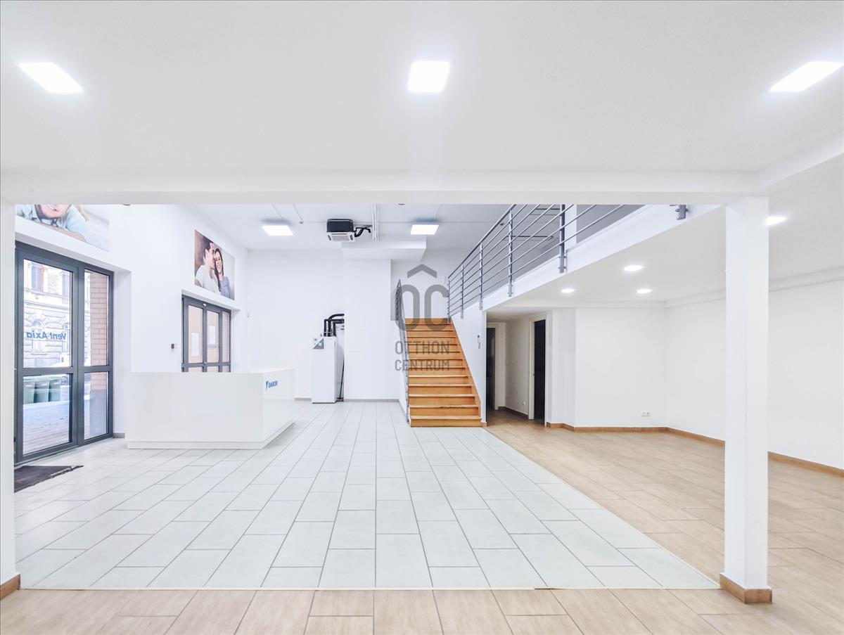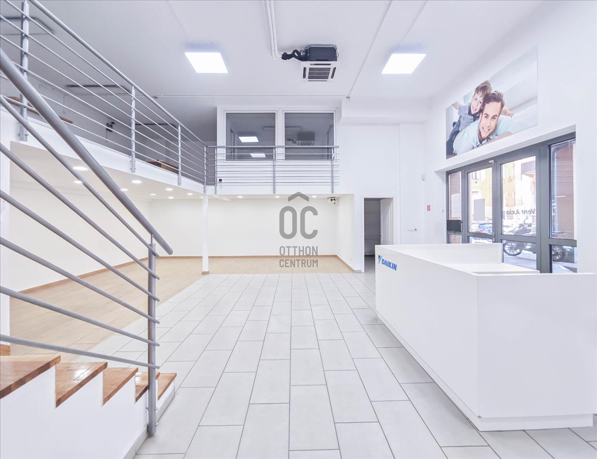 Széles utcafronttal rendelkező, üvegportálos, belső kétszintes...