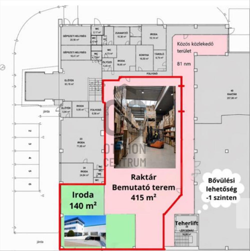 Az ingatlan egy 140 m²-es irodából, valamint egy 415 m²-es raktár- vagy showroom egységből áll, amelyek az épület földszintjén helyezkednek el, és igény szerint összenyithatók, így maximális rugalmasságot biztosítanak.
