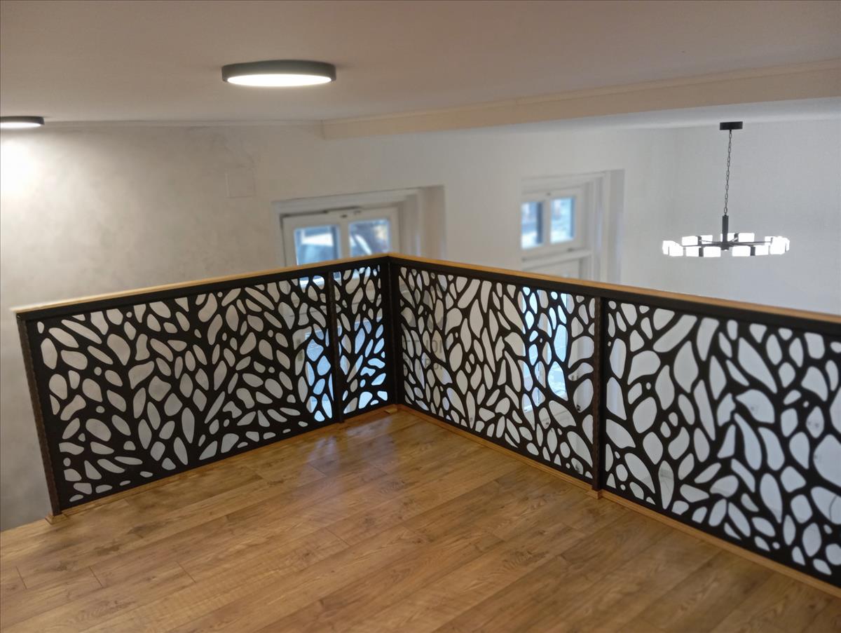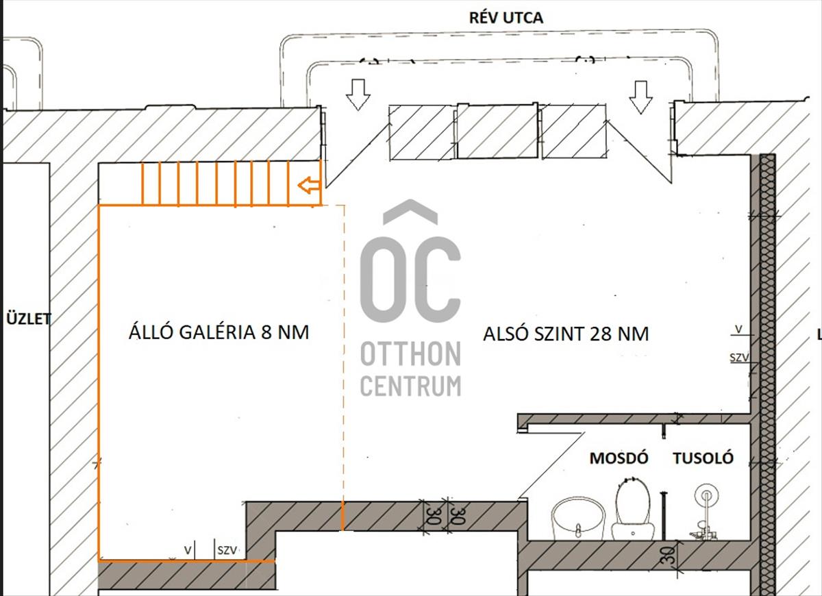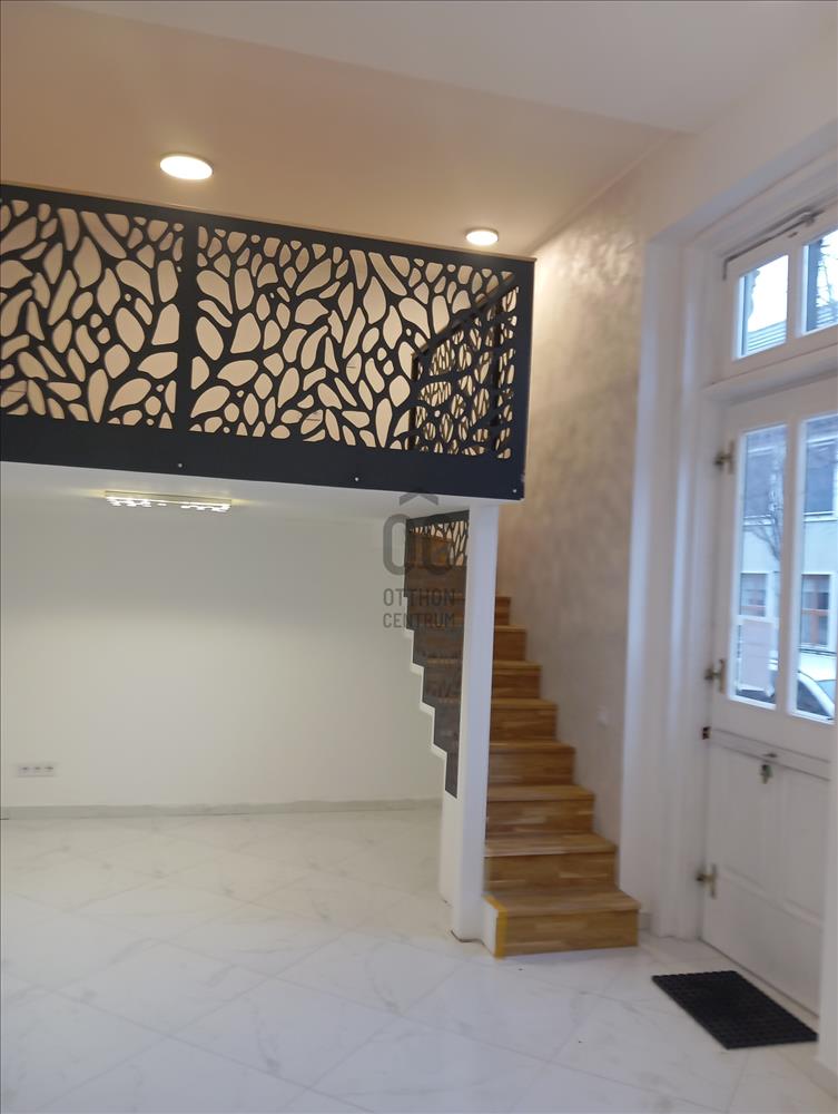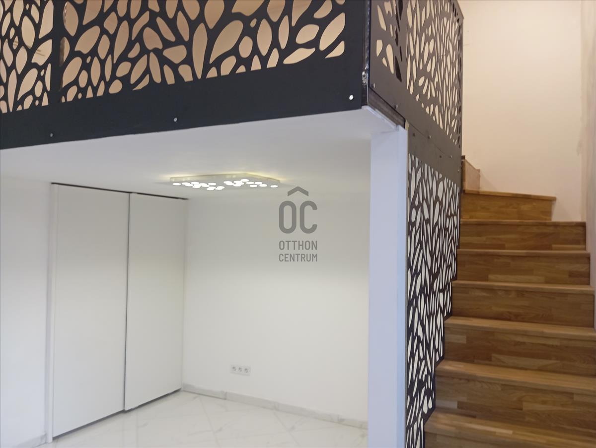 28 Nm-es az üzlet + 8nm-es, állógaléria (175 cm-es) növeli az üzlet terét, igényes tölgyburkolatú lépcsővel és lézerperforált fém korlátmezővel.